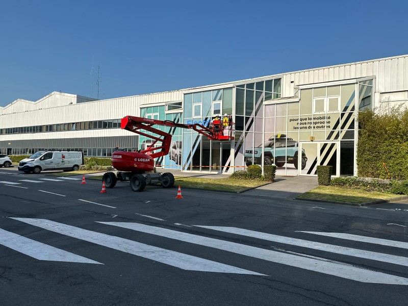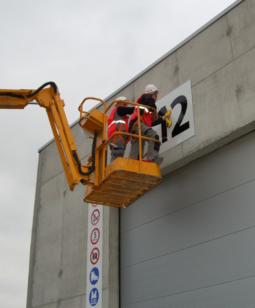 Pose de panneaux signalétiques en hauteur à l'aide d'une nacelle